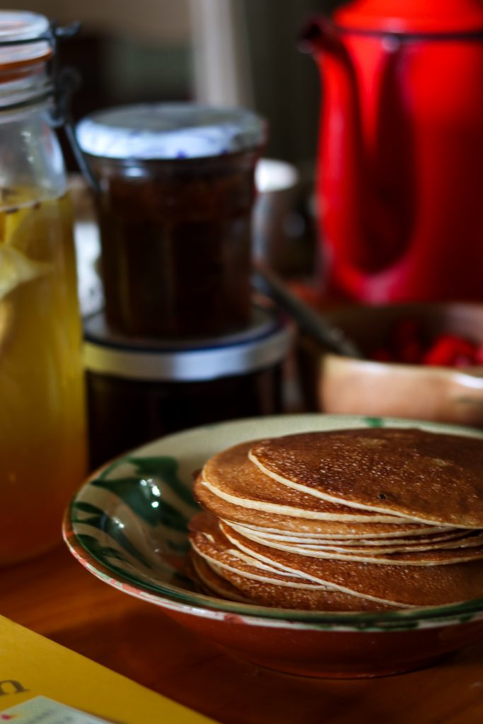 - Petit-déjeuner avec la Green Family – Petit déjeuner green avec une base d’alimentation vivante: Kéfir maison, crêpes, pâte à tartiner à base de dattes (que Julie nous a préparé la veille), oeufs des poules, fruits frais…