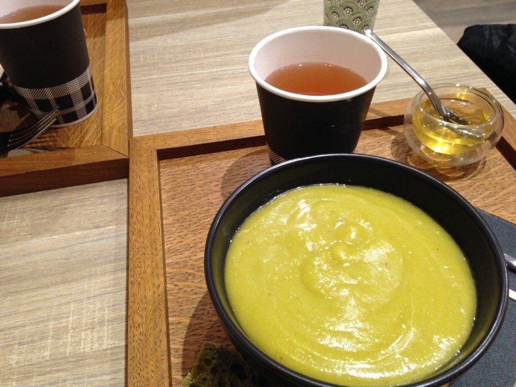 Pour ma part j’ai goûté le velouté de pois cassé au cumin accompagné d’une tranche de pain grillé et de miel. Un velouté délicieux et très original. Je n’aurais pas pensé à mettre du cumin à l’intérieur et je dois avouer que le résultat est vraiment pas mal. A retenir.