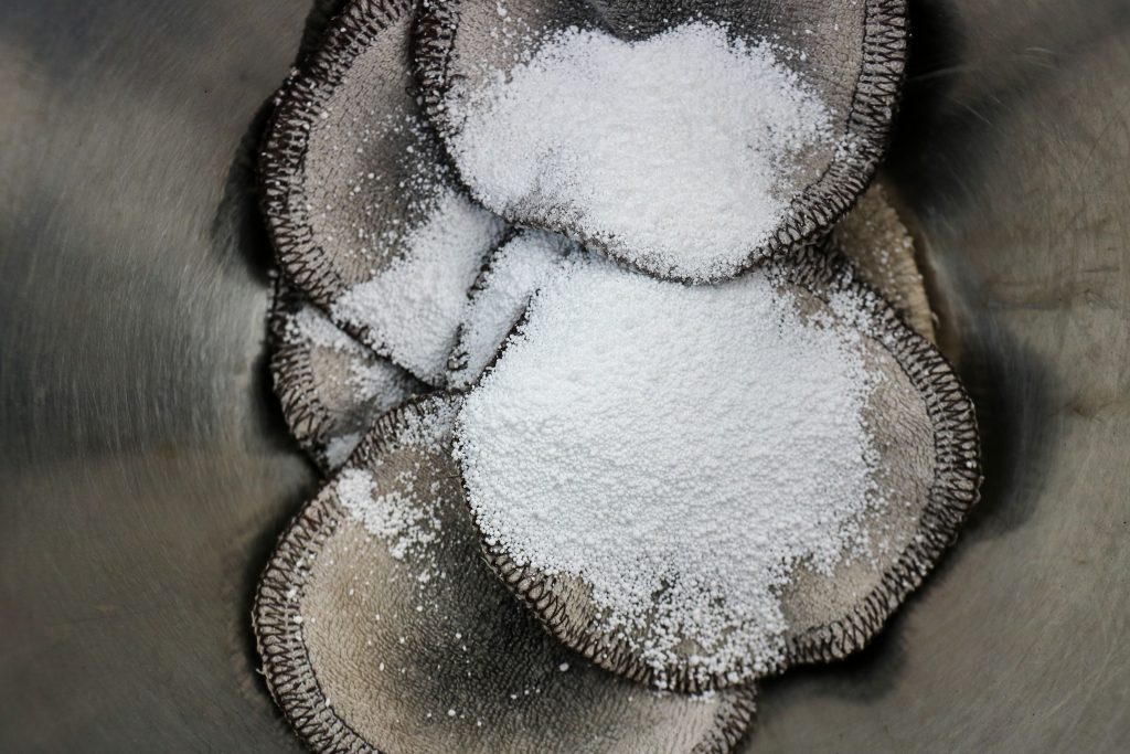 - Saupoudrez 2 cuillères à soupe de percarbonate de soude sur vos disques ce qui va permettre de rendre vos disques démaquillants plus blanc.