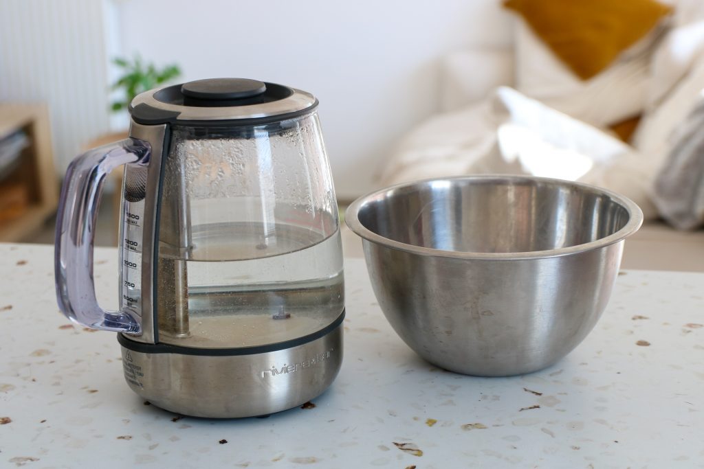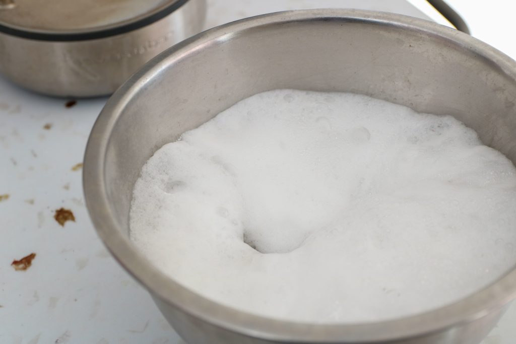 Le mélange va beaucoup mousser après avoir versé l’eau bouillante, faites attention de ne pas en mettre partout. Le mieux est de faire ça dans la douche au moins vous ne risquez rien.