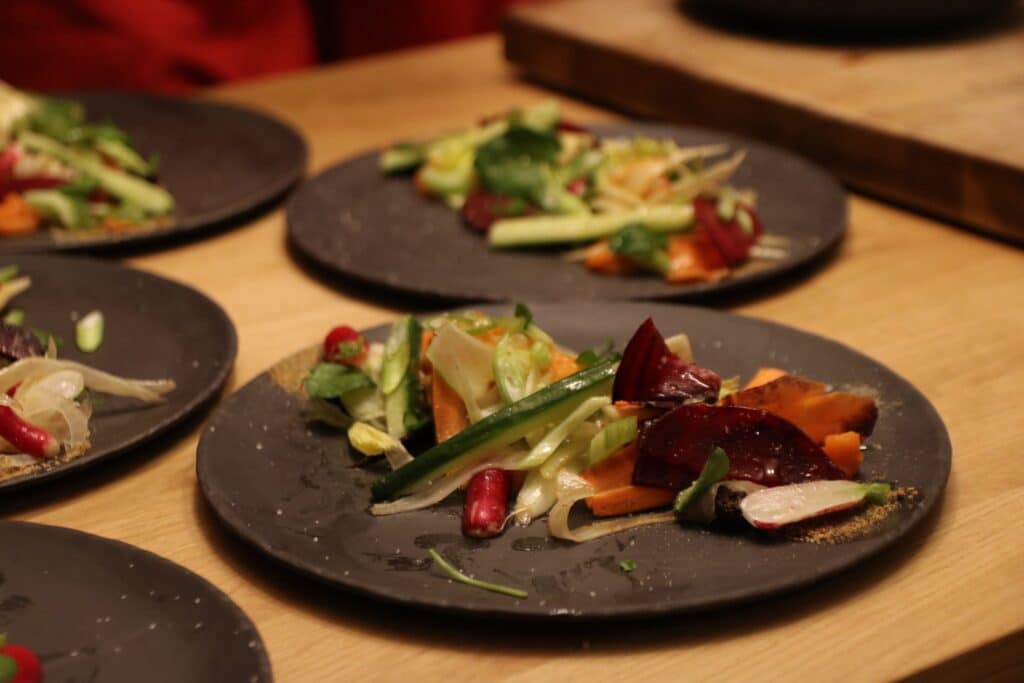 Durant le cours de cuisine, nous avons réalisé étape par étape chacune des recettes prévues au menu en se partageant les tâches. Ce fut très interessant ! J’ai appris plein de choses.