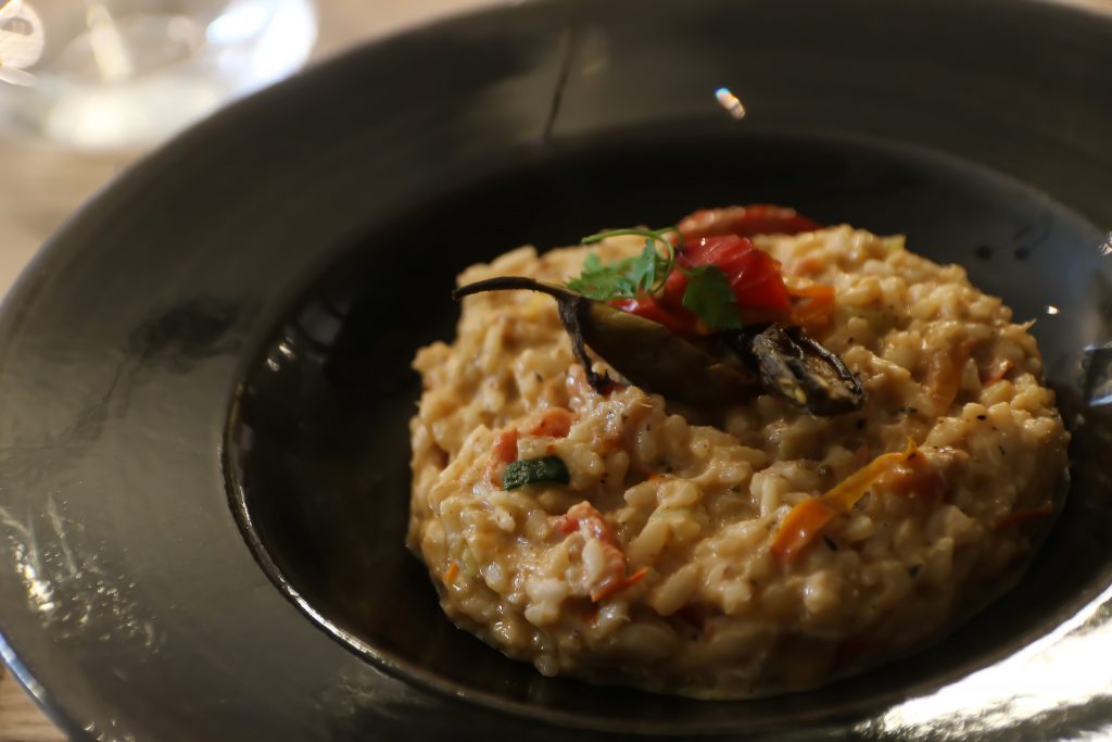 - Risotto aux crabes, tomates confites, bisque de crustacé, légumes et parmesan