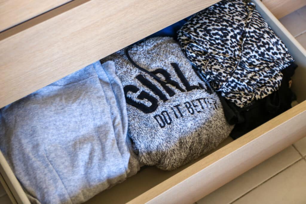 Pour le rangement dans la commode, nous avons opté pour le pliage vertical de Marie Kondo. Un pliage très pratique puisqu’il permet de voir en un clin d’œil toutes les pièces disponibles dans son dressing. Cette technique évite d’empiler les vêtements et d’oublier les pièces qui se retrouvent sous la pile.