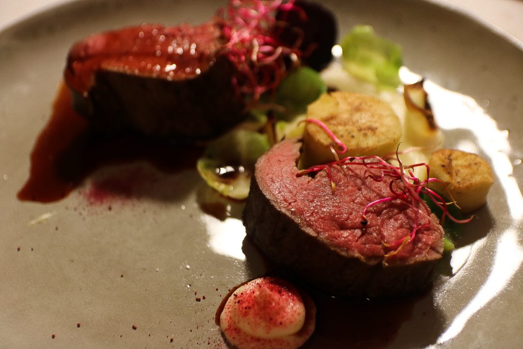 PLAT Pièce de bœuf basse température, jus de viande à la betterave, légumes du marché
