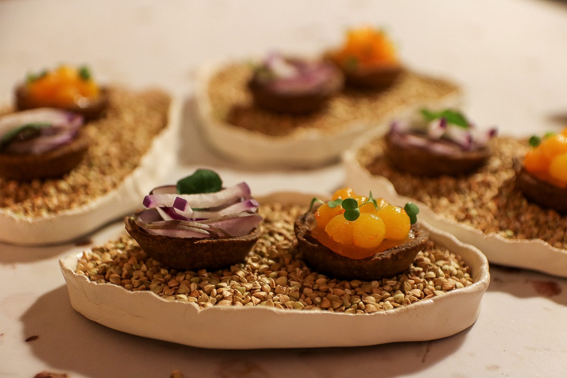 AMUSE-BOUCHE Duo de tartelettes surprises (1 radis – capucines / 1 potimarron – gelée de clémentines)