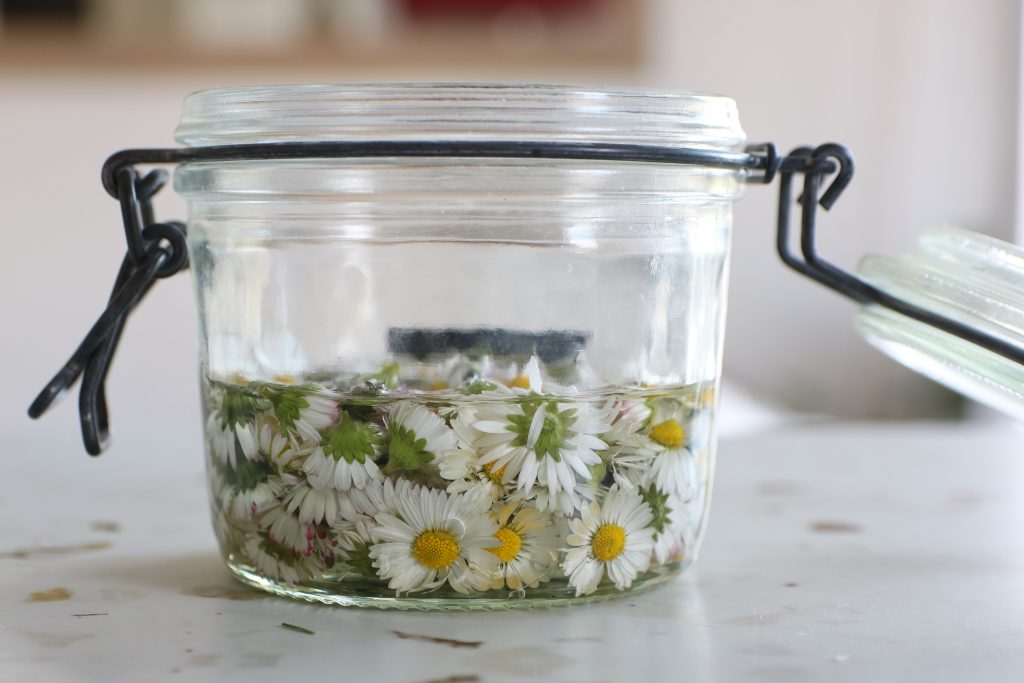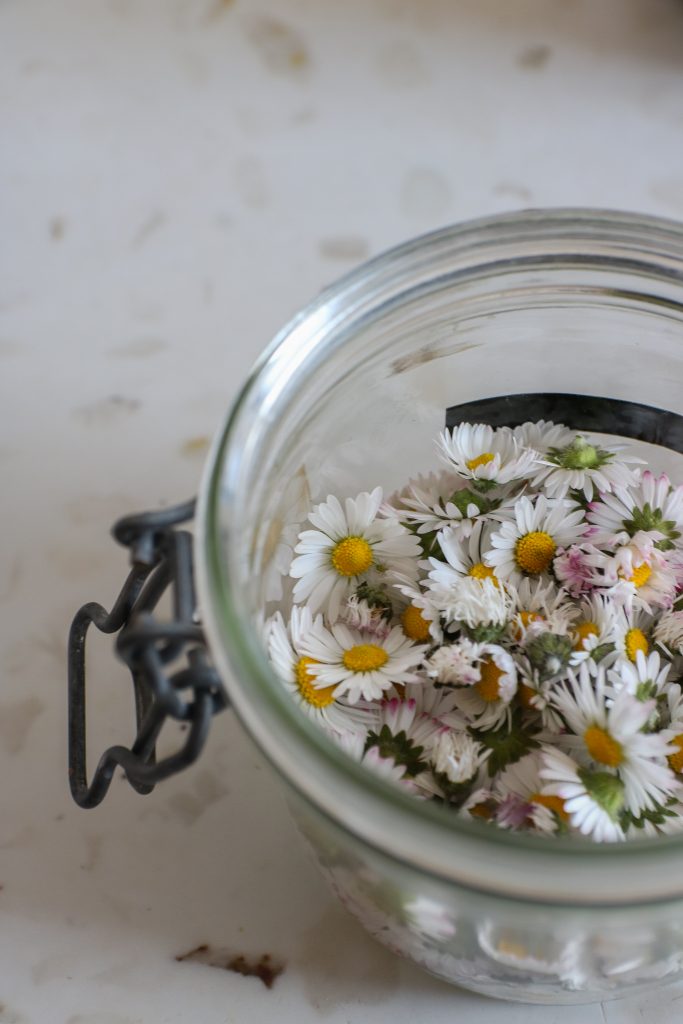 - Placez les pâquerettes fraiches ou séchées (mais jamais au soleil, elles perdraient toutes leurs propriétés) dans un bocal