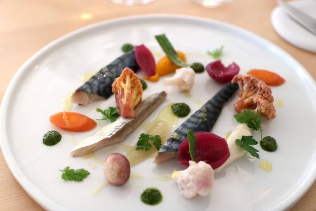 Maquereau mariné aux baies roses – Pickles de légumes et pesto à l’estragon