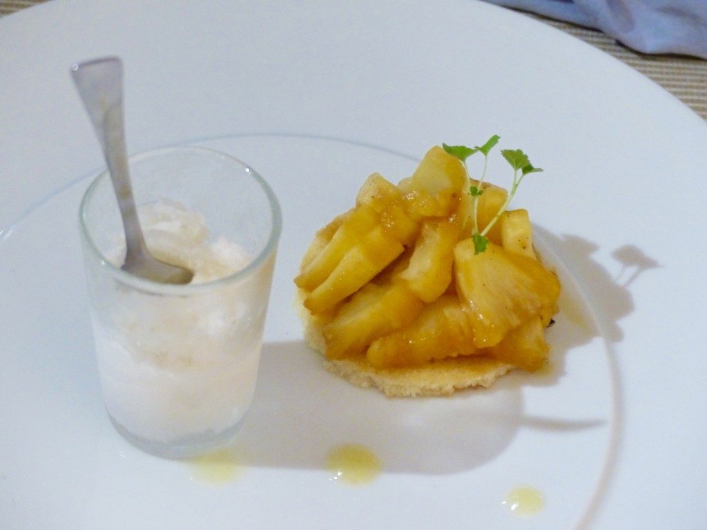 – Ananas rôti & granité de Pina Colada. Un dessert basique avec un mélange de chaud et froid très agréable.