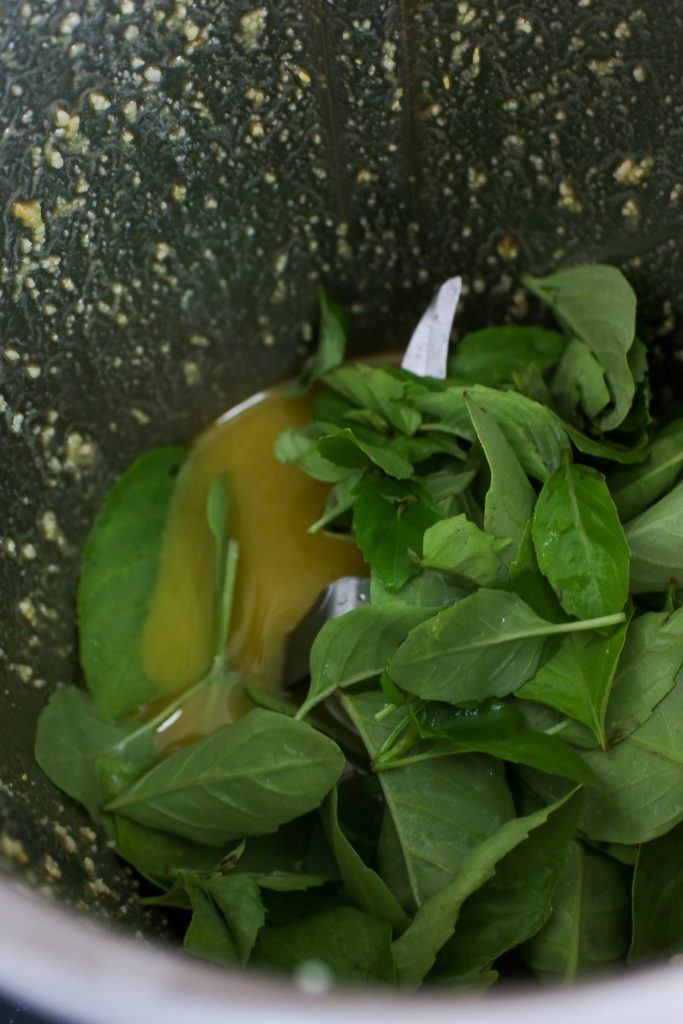 - Mixez l’huile d’olive chaude avec les pignons