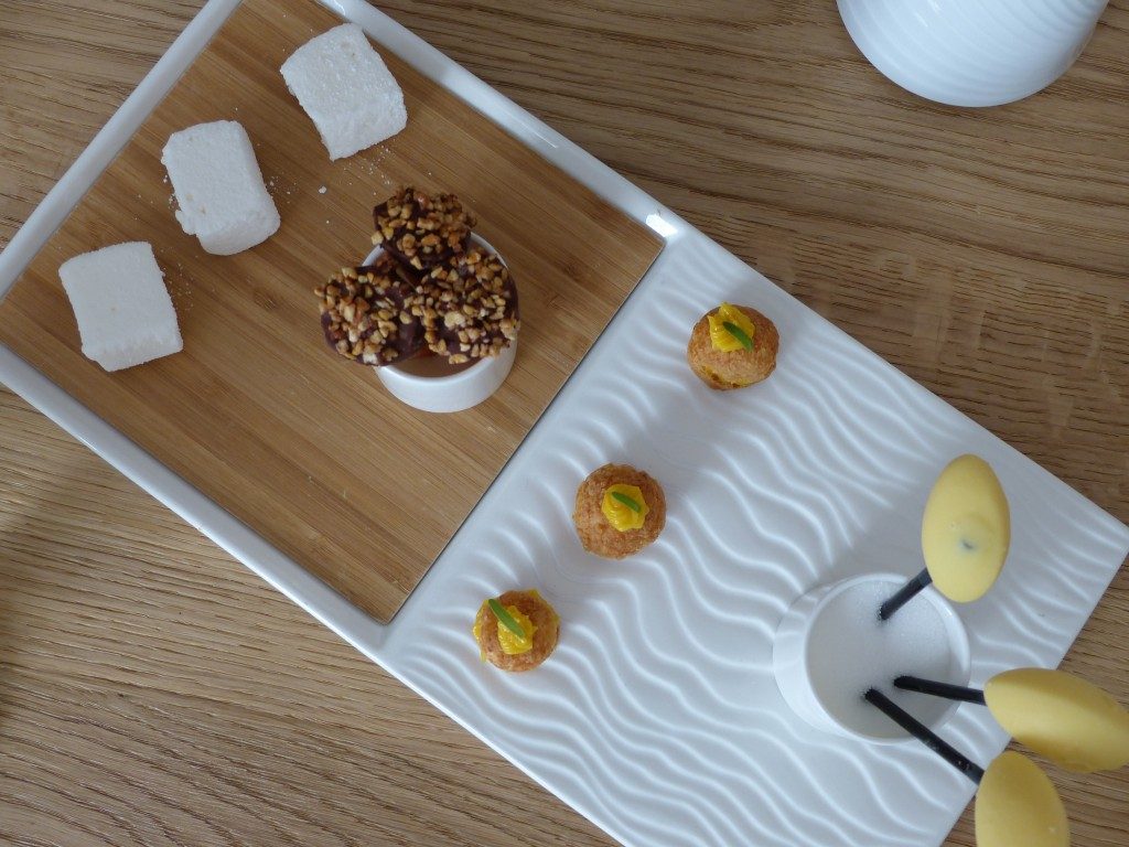 Mignardises pour accompagner le café (Guimauves au coca cola / Cônes au chocolat / Choux à la mangue / Sucettes glacées au calisson et au chocolat blanc)