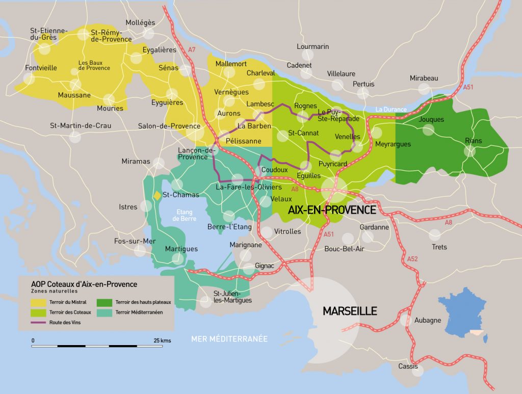 Les vignes des Coteaux d’Aix-en-Provence sont les plus à l’ouest des vins de Provence. L’aire d’appellation s’étend de la Durance à la mer Méditerranée, et de la vallée du Rhône à l’ouest à la montagne Sainte-Victoire à l’est. Elle entoure l’étang de Berre et traverse les paysages peints par Cézanne.