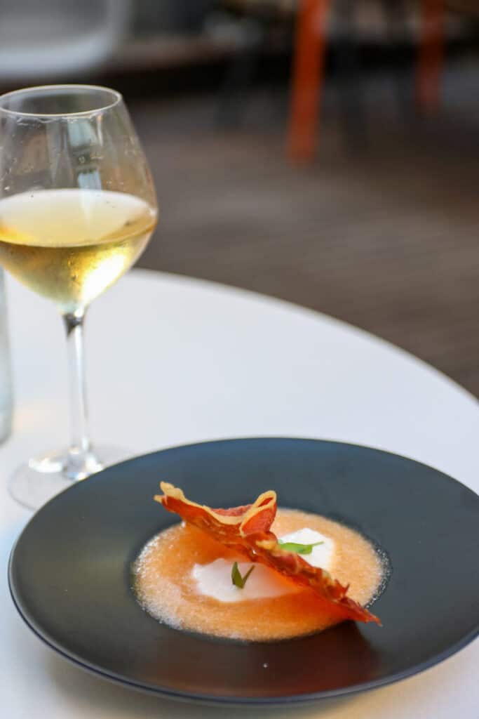 Soupe de melon à la crème de chèvre et sa chips de jambon cru