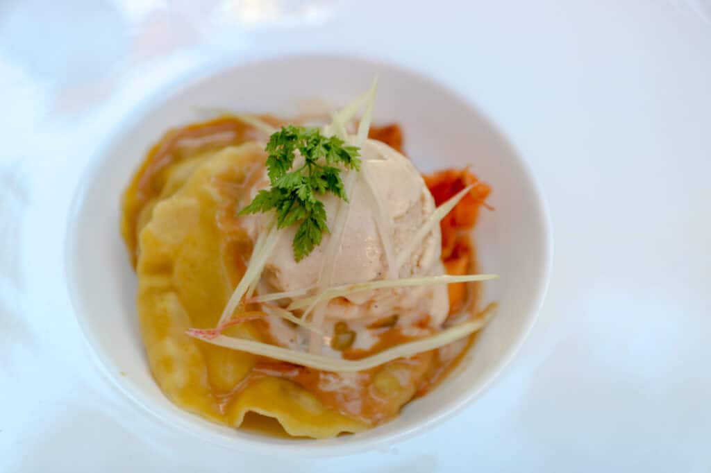 Poêlée de girolles, raviole de foie gras à la rhubarbe et glace aux cèpes