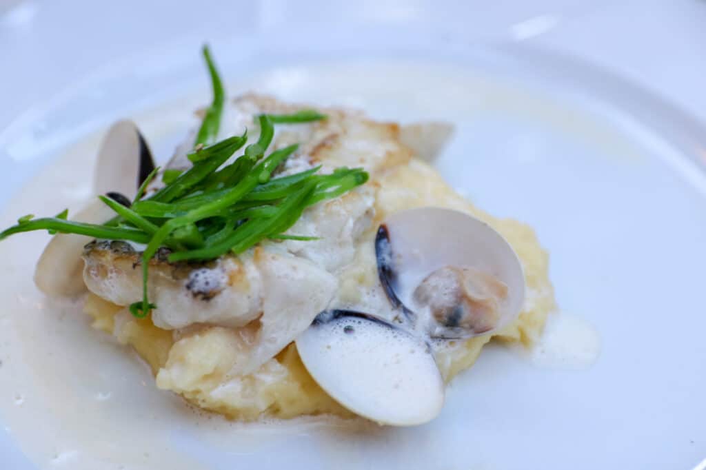Filet merlu de ligne, marinière de palourdes, écrasé de pommes de terre ratte
