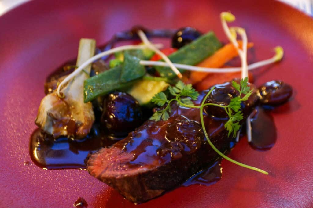 Aiguillettes de canard au poivre de Sarawak, quartiers de fruits et légumes, bigarade aux cerises